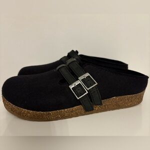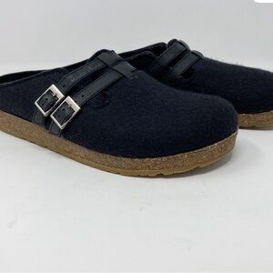 Haflinger Haley Wool Clog in Black with Double Adjustable Buckle, Size 38/7 US
