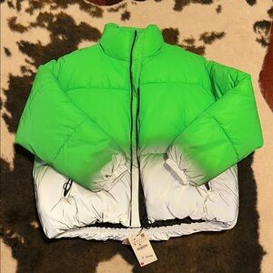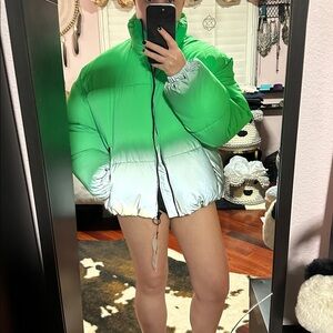 Stay warm and stylish with this vibrant green gradient puffer jacket. Perfect for chilly days, this jacket combines comfort with a bold look. Brand new; never worn with tags