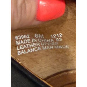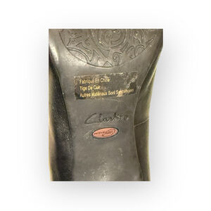 The item is a pair of Clarks Artisan black leather open-toe heels, size 6M. The upper is made of leather, while the balance is man-made. The heels are approximately 3 inches tall.. There are minor scuffs on the toes otherwise good condition
