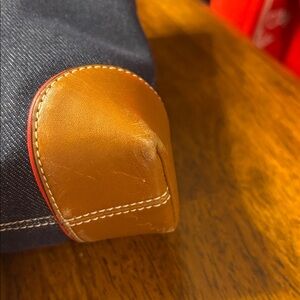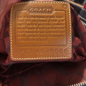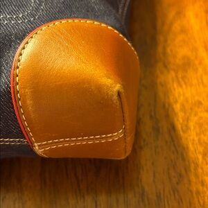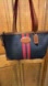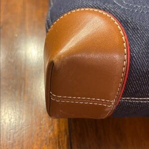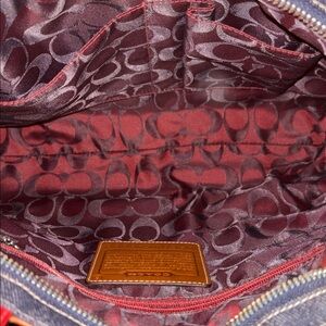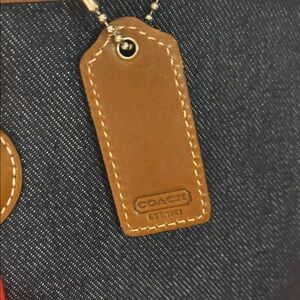 Vintage coach varsity stripe denim leather trim tote. The corners have very minimal ware as noted in the photos zippers were very smooth. Interior is spotless. Handles are in great condition. There’s one small spot on the back as noted in the photo. The bag measures 13 x 9 x 3 with a handle drop of eight please look at all pictures closely and ask any questions.