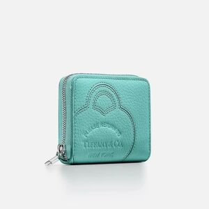 Elegant turquoise leather card holder by Tiffany & Co. Features embossed logo design.