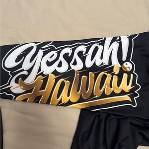 Made in hawaii leggings with graphic on leg “Yessah Hawai’i” airbrush style…New no tags size XL….Stylish black leggings featuring a bold white graphic design. Perfect for casual wear or workouts.