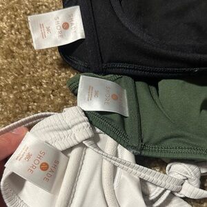Ribbed bikini tops set by Shade & Shore. Includes black, green, and white. Ideal for comfort and style.