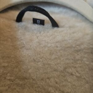 Stylish black leather jacket with cream shearling collar. Features zippered pockets and belted waist. Perfect for a chic look.