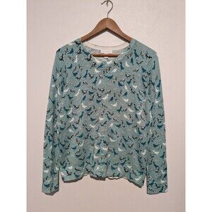 Charter Club Long Sleeve Blue Cardigan Sweater Bird Pattern w/ Rhinestones Sz S.