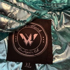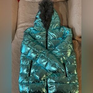 New without tags. Turn heads in this attention getting greenish blue metallic puffer jacket with faux fur collar. Stylish and warm for winter. Size XL