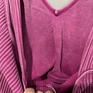 Stylish ribbed crop top in vibrant pink. Features a flattering V-neck and comfortable fit. Ideal for casual outings.