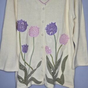 Storybook Knits Womens Cardigan Tulip Applique Sequin Easter Spring pastel Sz L