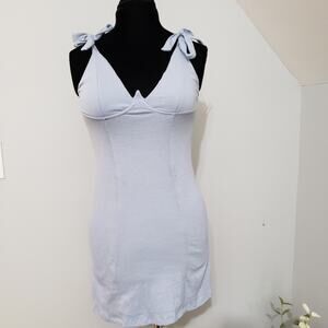 Light Blue Textured Casual Dress with Shoulder Ties and Plunge Neckline