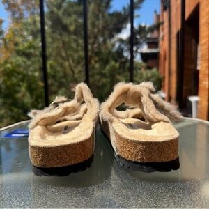 slip on shoes, fur, furry, buckle, slippers, sandals, birkenstock arizona, shearling birkenstock, suede birkenstock sandals, fuzzy slides, suede sandals, purple sandals, winter slippers, cozy shoes, buckle slides, sherpa lining, free people, casual shoes