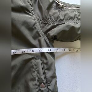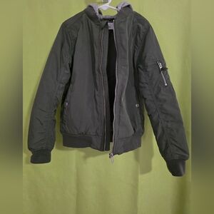 Stylish hooded bomber jacket by H&M. Features zip closure and pocket details. Ideal for casual wear.