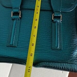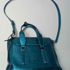 Elegant teal satchel with a textured finish. Features a secure clasp and adjustable strap.