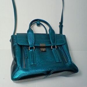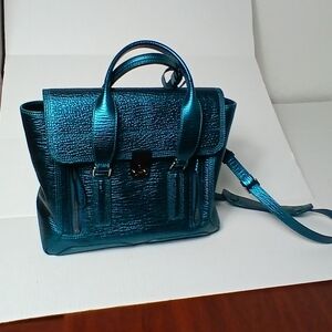 3.1 Phillip Lim Medium Pashli satchel bag in metallic blue embossed leather.