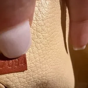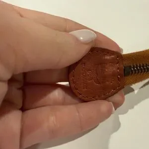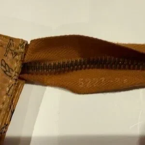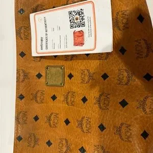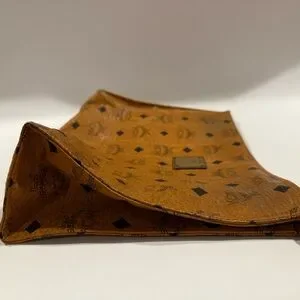 Stylish MCM clutch in tan leather. Features black logo pattern and gold accent.