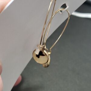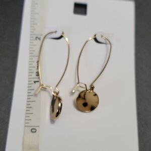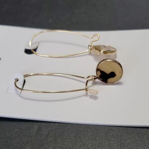 Pretty earrings have a cream and brown circular charm that dangles from gold colored ear wire.