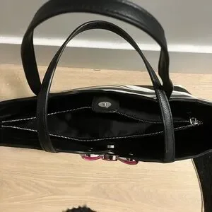Stylish and chic, this black and white striped tote bag features a charming pink bow accent. Perfect for adding a touch of elegance to any outfit.