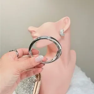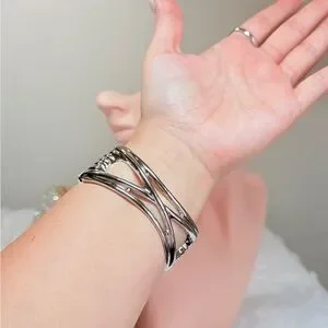 Elegant silver cuff bracelet with a modern design. Perfect for adding a touch of sophistication to any outfit.
