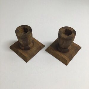 Vintage - Pair of Small Solid Wood Candlestick Holders 3” Primitive Folk Art Rustic. Square base. Excellent vintage condition. Matte unfinished. Not sure of the type of wood? Farmhouse, cabin, rustic look. Could also be painted, stained, etc.