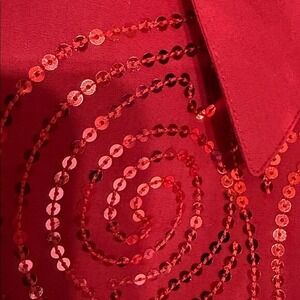 Keywords: Bob Mackie, Wearable Art, sequin shirt, red blouse, button down shirt, embellished shirt, sequin top, long sleeve shirt, party top, statement blouse, designer shirt, retro style, glamorous top