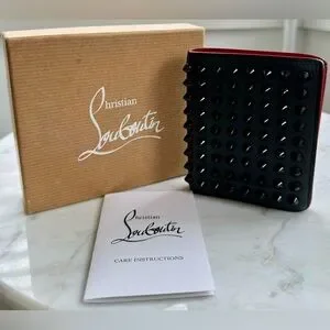 This studded wallet is the epitome of edgy sophistication, designed for those who crave style and functionality. Crafted from premium Calfskin leather, this black cardholder wallet boasts a sleek folding design adorned with striking spikes, making a bold statement wherever you go. Inside, the color is red, and you'll find a thoughtfully organized interior with a spacious bill compartment, four convenient card slots, and a secure coin pocket.