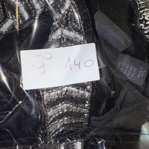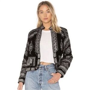 500 Maison Cinqcent black velvet jacket features intricate beading, silver embroidery, and sequins in geometric patterns. It has an open front design size XS