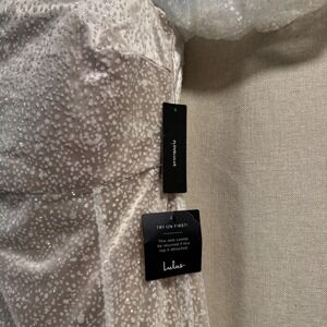 Keywords: Lulus dress, midi dress, champagne dress, sparkle dress, sequin dress, sweetheart neckline, puff sleeves, party dress, formal dress, cocktail dress, wedding guest dress, special occasion dress, beige dress, white dress