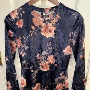 Altar'd State Women's Floral Navy Crushed Velvet Dress Long Sleeve Small Mini
