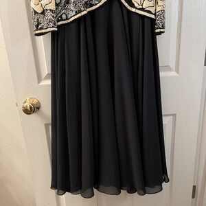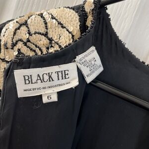 This stunning vintage Black Tie gown is perfect for any formal occasion. The black and ivory sequin beaded design on the chiffon fabric adds a touch of glamour, while the long sleeve and round neckline give it a classic look. The dress is lined and has a zip closure for easy wear. The dress is a size 6 and is made of polyester material. It has a beautiful floral pattern and is perfect for a wedding or any formal event. The dress is dry clean only and was made in China. This 90s style dress is a must-have for any fashionista.