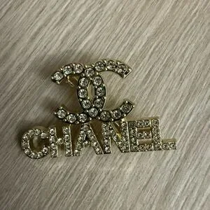 Dazzling upcycled CHANEL brooch with gold and silver tones. Embellished with sparkling crystals. Perfect for adding elegance. Upcycled items are created by repurposing authentic materials or components from existing items into a new, one-of-a-kind piece.