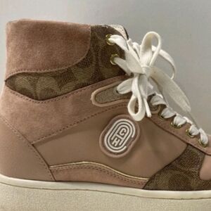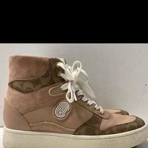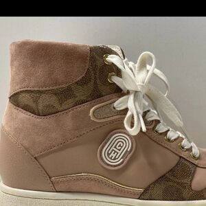 Stylish and comfortable high-top sneakers featuring a chic pink and brown design. Perfect for casual outings and adding a trendy touch to your outfit.