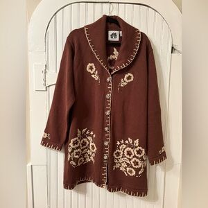 Storybook Knits Long Embroidered Floral Duster Cardigan Brown Women’s 2X