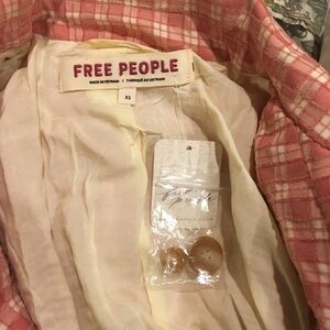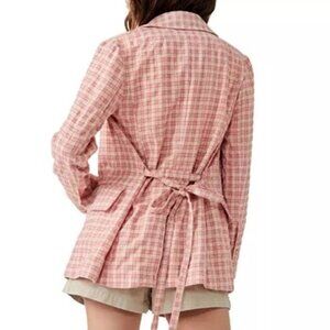 The Free People Olivia Blazer in peachy pink gingham offers a chic update to classic outerwear, showcasing modern design elements and luxurious fabric.