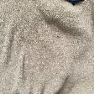 Soft beige fleece with navy trim. Features button-up collar and front pocket. Perfect for athleisure, activewear, hiking , outdoors, winter