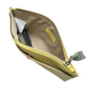 New with tags women’s J. Crew butter yellow pebbled leather party pocket clutch purse. Features a two pockets with zipper and snap button closure and tassel pull.