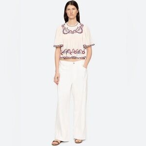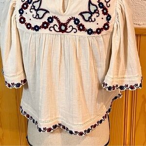 Cute never worn Soren embroidered cropped top with short bell sleeves. Front has pleating across the bust area. Colors are maroon, navy blue with a cream background. Elastic loop and button closure at the back neck.