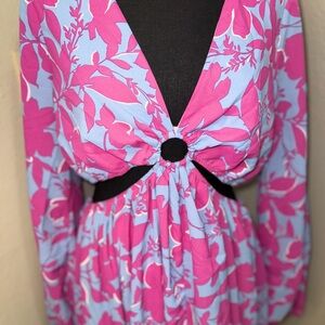 Step out in style with this elegant long sleeve dress, featuring a vibrant pink and blue floral design. Perfect for any occasion, this dress combines comfort and sophistication.