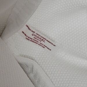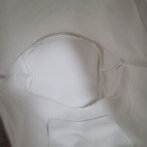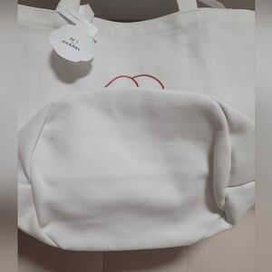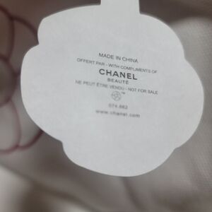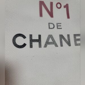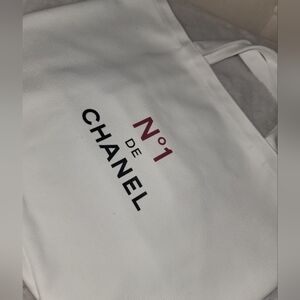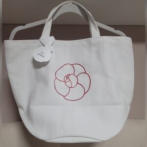 This is a Chanel Beauty White canvas tote with red camellia design on other side.