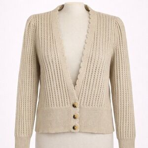 Charter Club beige open knit cardigan. Elegant scalloped trim along the neckline and button front closure. Full length sleeves with ribbed cuffs. A versatile layering piece perfect for spring evenings or a casual weekend outing.