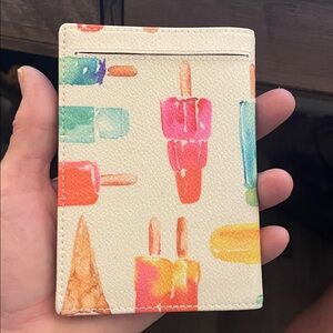 This is a really cute Kate Spade passport holder. Has Popsicles and ice cream cones. It’s just been sitting in my desk waiting for someone else to enjoy it. Has a couple little specks on it… See the photos.