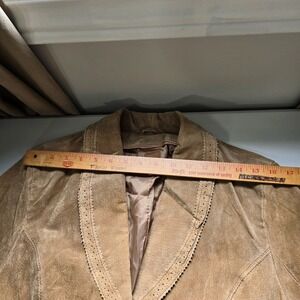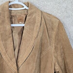 Wilsons women’s suede leather jacket in brown, designed with a belted waist and decorative cutwork trim. Features a tailored silhouette with western-inspired detailing, suitable for casual wear, layering, or statement outerwear.