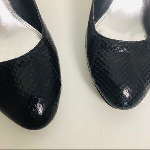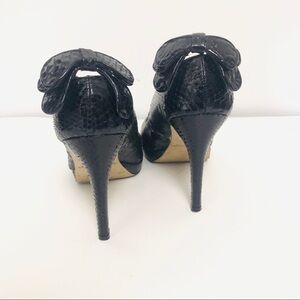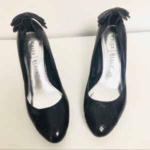 White house black market black pumps pho snakeskin finish black bow on the back by the heel in great condition like new see photos for more details