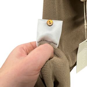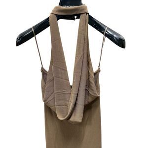 Smoke free, pet free warehouse. New with tags, retail $750. Stretchy knit jersey fabric. Maxi length. Slit down one side. Draped cowl halter neck with a button close high neck collar. Open strappy back. Light dusty tan brown color.