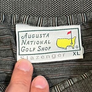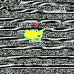 Augusta National Golf Shop Slazenger polo shirt with a classic striped pattern. Features the iconic Augusta National Golf Club logo embroidered on the chest and a contrasting trim on the collar and sleeve cuffs. A timeless piece for any golf enthusiast.