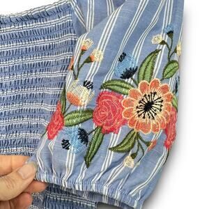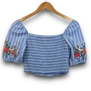 Womens Puff Sleeve Smocked Crop Top Embroidered Striped Blue White Size Small