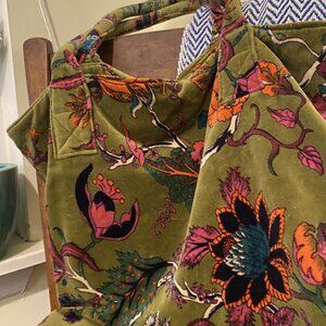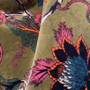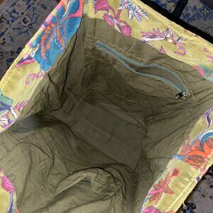 Bohemian vintage style tote bag, great condition, velvet material green with floral design. inside is cotton. sturdy handles. Shoulder or hand carry. snap closure. Bag is 17" deep. pre-owned.