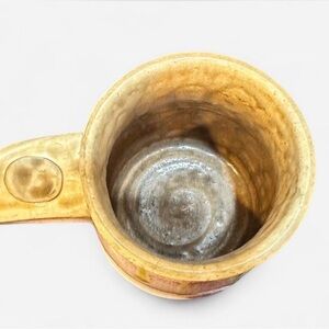 Stunning authentic Gandee Pottery mug with a premium golden honey lava drip glaze over a raspberry speckled stoneware body.