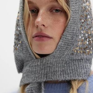 Elevate your style with this chic sequin-embellished gray knit hood. Perfect for adding a touch of sparkle to any outfit.