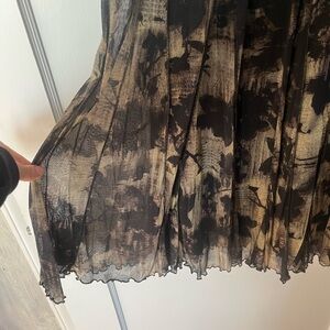 This black micro mesh drop waist dress by Elana Kattan features a watercolor moody floral pattern, 3/4 sleeves, and a V-neckline (front and back) giving off a whimsical gothic fairy vibe. The fit & flare style, midi length, and size small make it suitable for various occasions like travel, weddings, parties, or casual/formal events. The dress is made of nylon mesh fabric, lined for comfort, and has a vintage appeal with y2k, punk, grunge, and 90s influences. Perfect for those who appreciate a unique and edgy look with a touch of femininity. Made in the USA