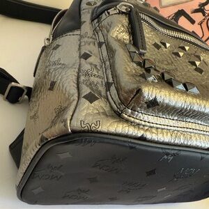 Authentic MCM backpack crafted from metallic silver Visetos coated canvas with luxe leather trim and signature pyramid stud detailing throughout. Features classic MCM logo print, a front zip pocket, adjustable leather shoulder straps, and top handle for easy carry. Spacious interior perfect for everyday use while still maintaining a sleek, stylish look.