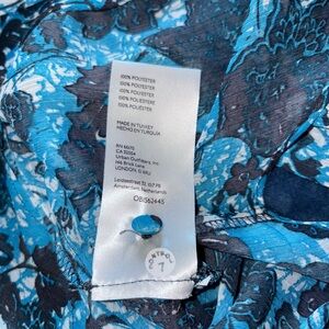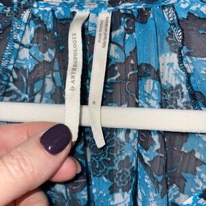 Romantic Anthropologie floral blouse in vivid blues and charcoal on a semi-sheer chiffon. Split V-neck with subtle ruffle detail and airy long sleeves—easy to dress up with trousers or pair with denim. Lightweight and flowy; looks great layered over a cami.